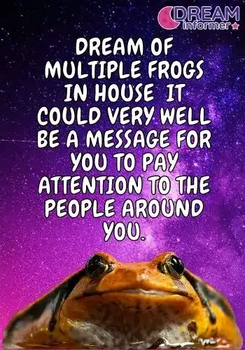 Dream about a frog lying dead on the ground. Another explanation for frogs assaulting you in a dream is that you are unhappy with the people in your life. Considering the evolution of a tadpole to frog means changes are ahead.